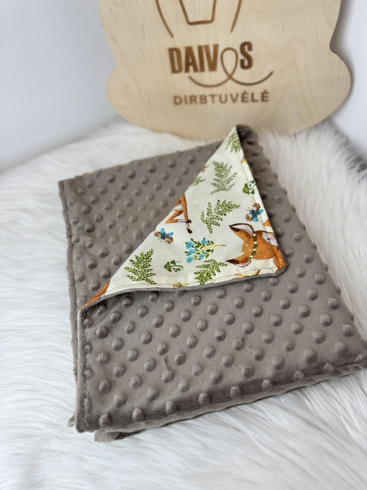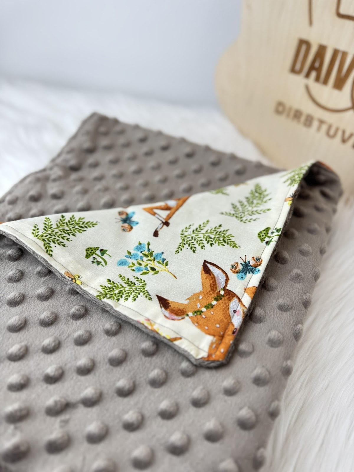 Dvipusis kūdikiui pledukas – jaukus ir praktiškas pasirinkimas kasdienai. Viena pusė medvilninė, kita – Minky audinys.